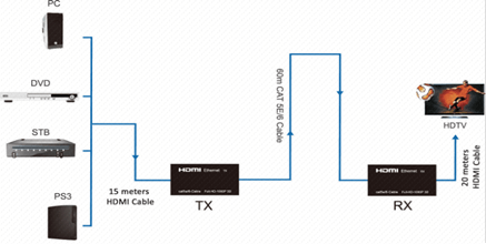 信號傳輸:用一條cat5或者cat6線(推薦使用)替代HDMI線,接收器和發(fā)射器之間線纜最長可達60米
